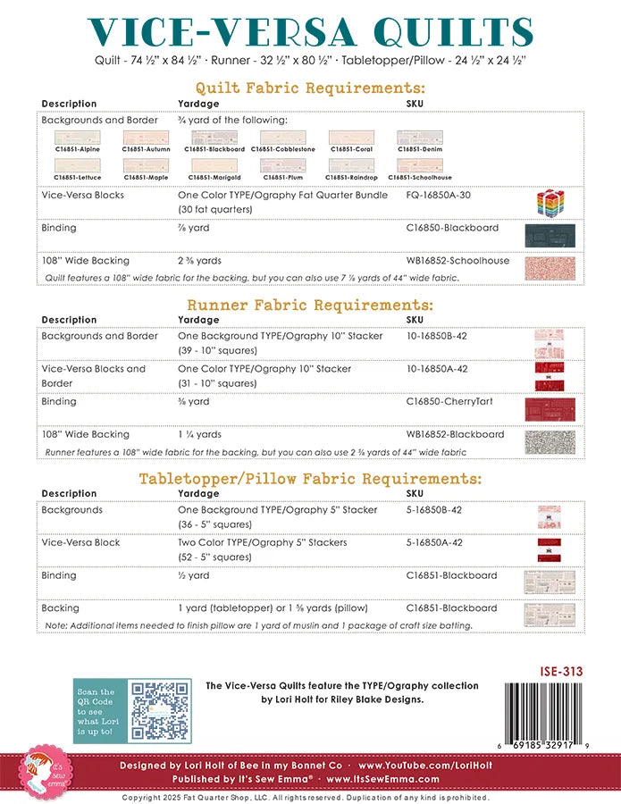 Sew along with Lori Holt of Bee in my Bonnet with this adorable Vice-Versa quilts pattern. Make a these fun projects with Lori's newest collection TYPEography or find a fun collection that speaks to you!